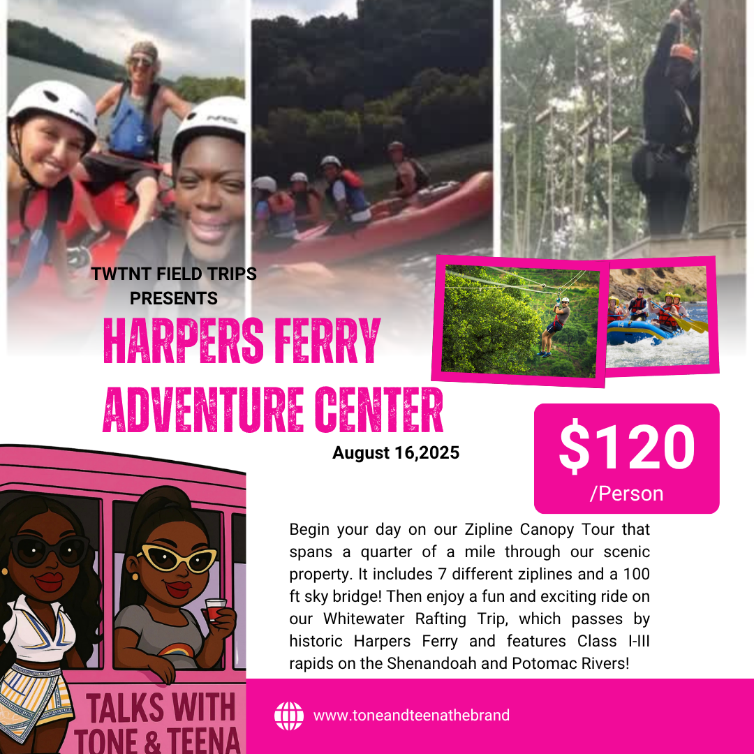 Begin your day on our Zipline Canopy Tour that spans a quarter of a mile through our scenic property. It includes 7 different ziplines and a 100 ft sky bridge! Then enjoy a fun and exciting ride on our Whitewater Rafting Trip, which passes by historic Harpers Ferry and features Class I-III rapids on the Shenandoah and Potomac Rivers!